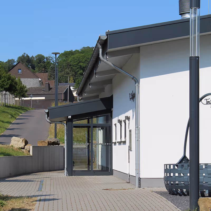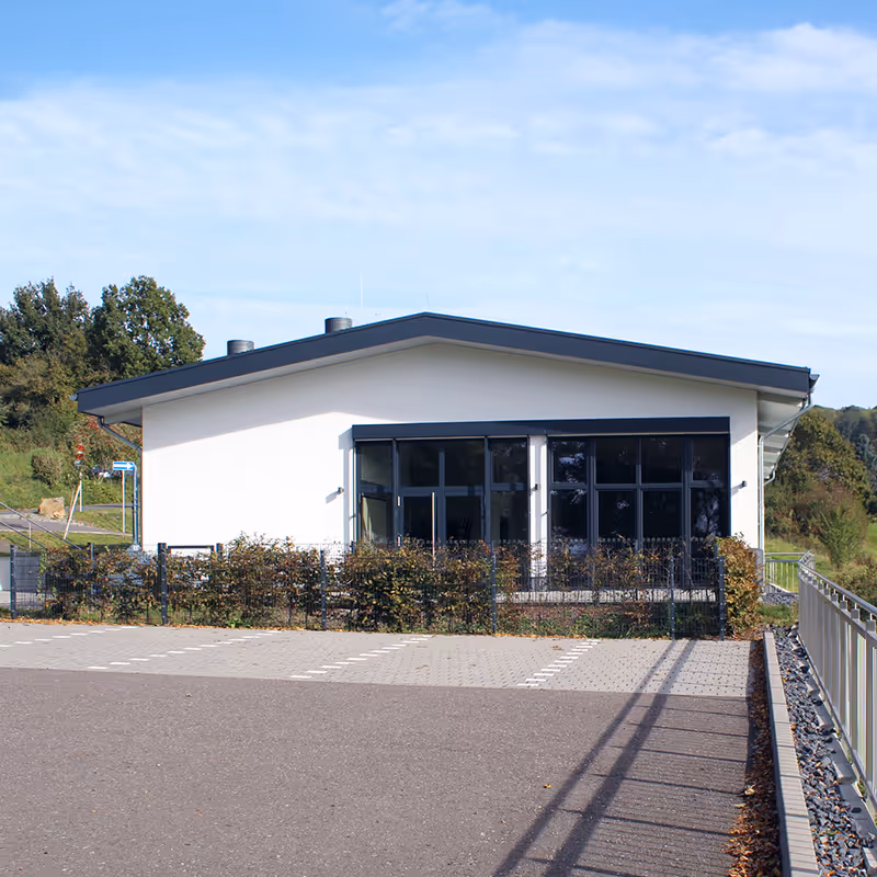 Der sichtbare Holzbau des Daches sowie große Glasflächen schaffen ein offenes und helles Raumgefühl. Eine angrenzende Terrasse bietet zusätzlich einen beeindruckenden Blick in die Landschaft des Westerwalds. Die Bauzeit betrug rund 20 Monate. Die Fertigstellung erfolgte im Jahr 2020.