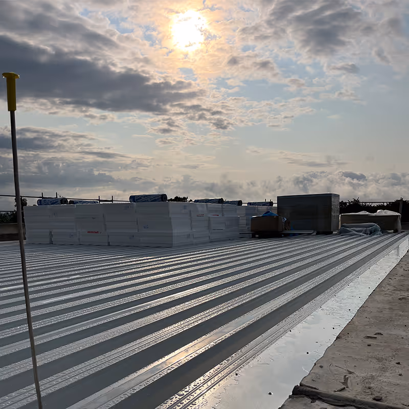 Konstruktion und Gebäudehülle wurden in massiver Bauweise aus Mauerwerk und Stahlbeton ausgeführt und mit einem Wärmedämmverbundsystem aus Mineralwolle, einem Foliendach sowie Aluminiumfenstern mit integrierter Sonnenschutzanlage kombiniert. Diese Bauweise gewährleistet nicht nur Stabilität, sondern auch eine sehr gute Dämmwirkung und langfristige Betriebssicherheit.