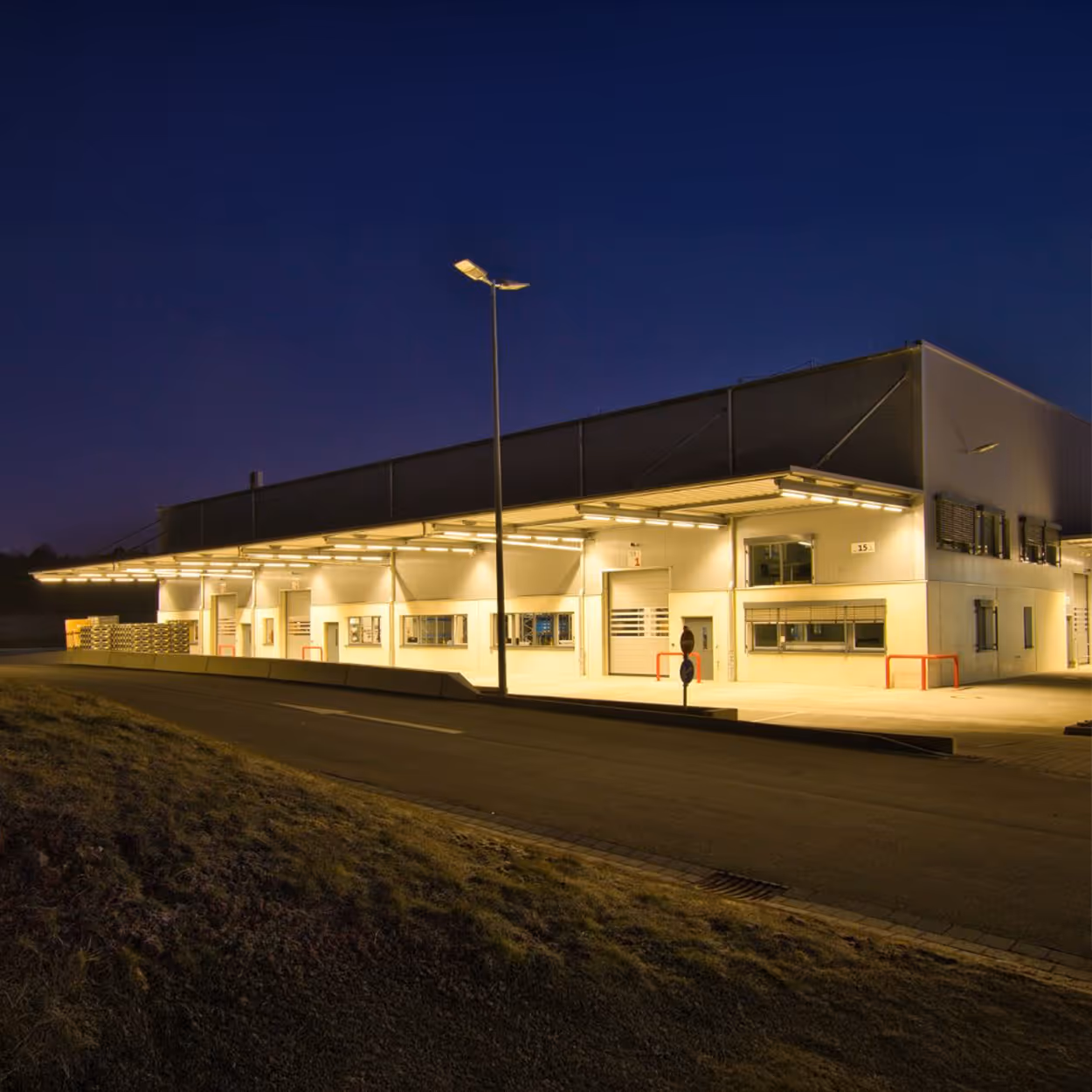 Eine Isowand-Fassade, moderne Rolltore, Photovoltaik-Vorbereitung und hochwertige Abdichtungs- und Bodenaufbauten sorgen für einen energieeffizienten und nachhaltigen Betrieb.
